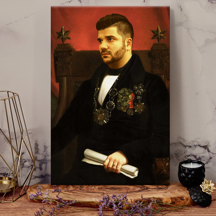 Solch ein Gemälde auf Leinwand ist zweifellos ein äußerst kreatives Geschenk, das Ihre Liebsten überraschen wird. Das königliche Porträt ist eine originelle Wanddekoration, die viele Lächeln hervorruft und einen echten Generator positiver Energie erzeugt!KÖNIGSPORTRÄT