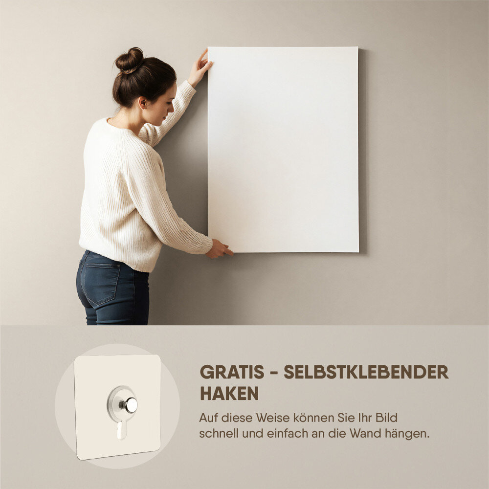 - Leinwandbild (100% Baumwolle, 360g/m2) in der ausgewählten Größe, das über einen inneren Holzrahmen gespannt wird