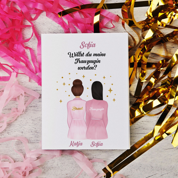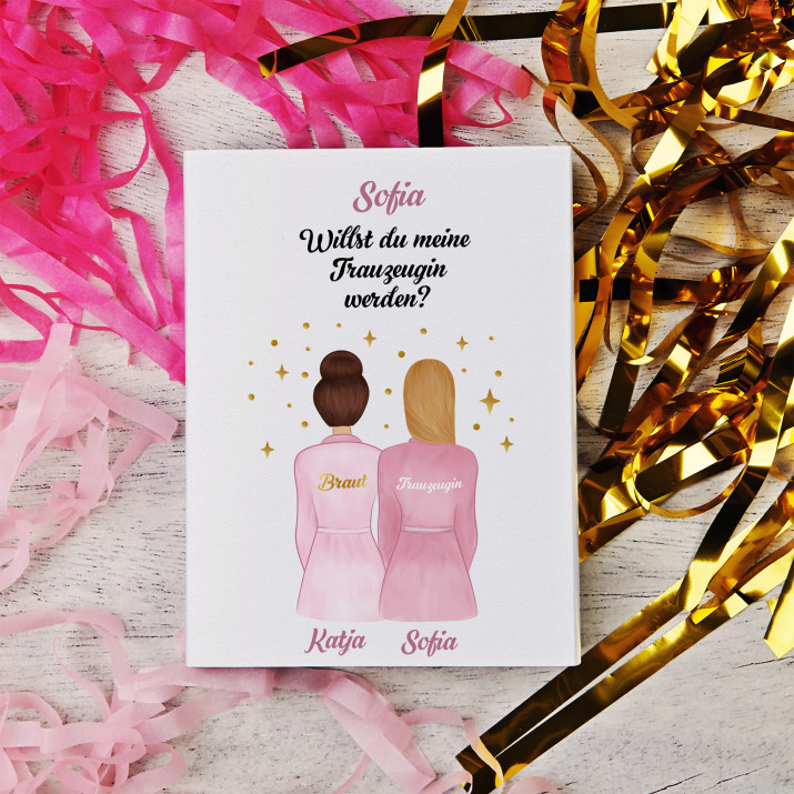 Normalerweise sucht niemand einen geeigneten Kandidaten für eine Trauzeugin. Für die meisten Bräute ist es einfach das Offensichtlichste auf der Welt, dass dieses besondere Mädchen auf der Welt ihre Trauzgeugin sein muss! Wussten Sie sofort, wen Sie für diese Rolle wählen würden? Bitten Sie sie, es auf süße und einzigartige Weise zu tun!AUSFÜHRUNG