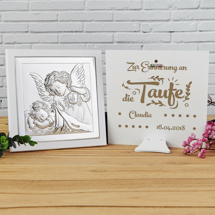 Taufe - Engel mit Laterne - Silbernes Bild mit Gravur