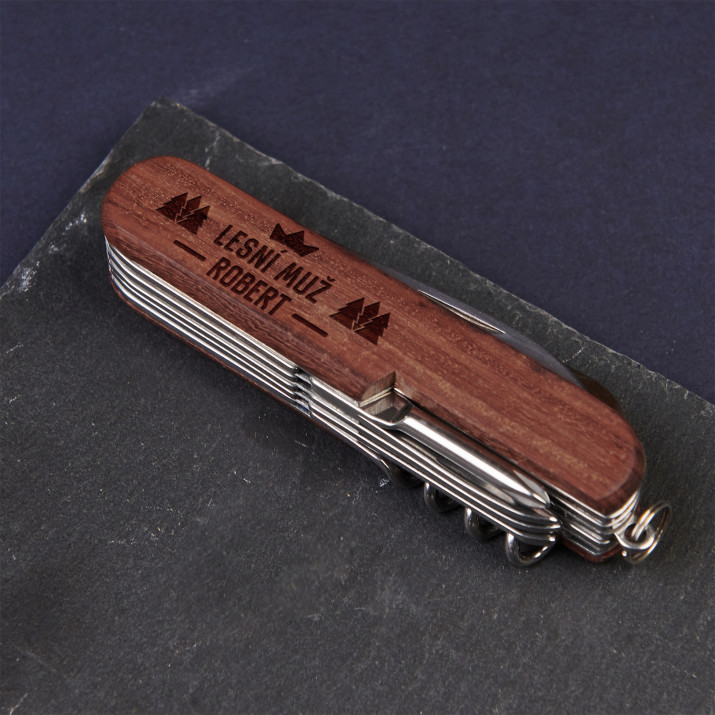 Das Taschenmesser aus Metall mit Holzgriff, das mit einer Gravur Ihrer Wahl verziert ist. Das Ganze sieht sehr elegant aus, was es zu einem großartigen Geschenk für jeden DIY-Enthusiasten macht und nicht nur! Abmessungen des gefalteten Taschenmessers: 90 x 20 x 25 mm. Das Produkt ist in einem weißen Karton verpackt.Alle Funktionen:
