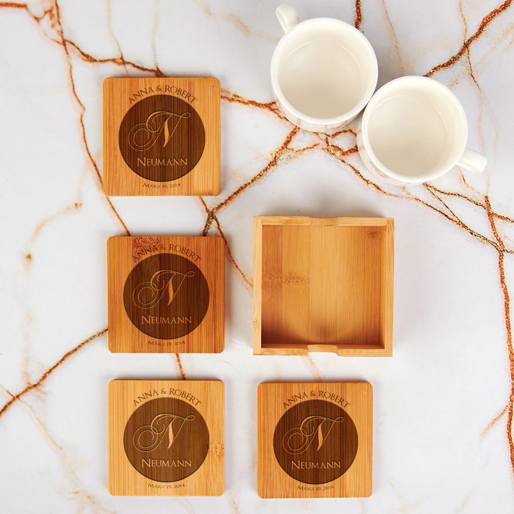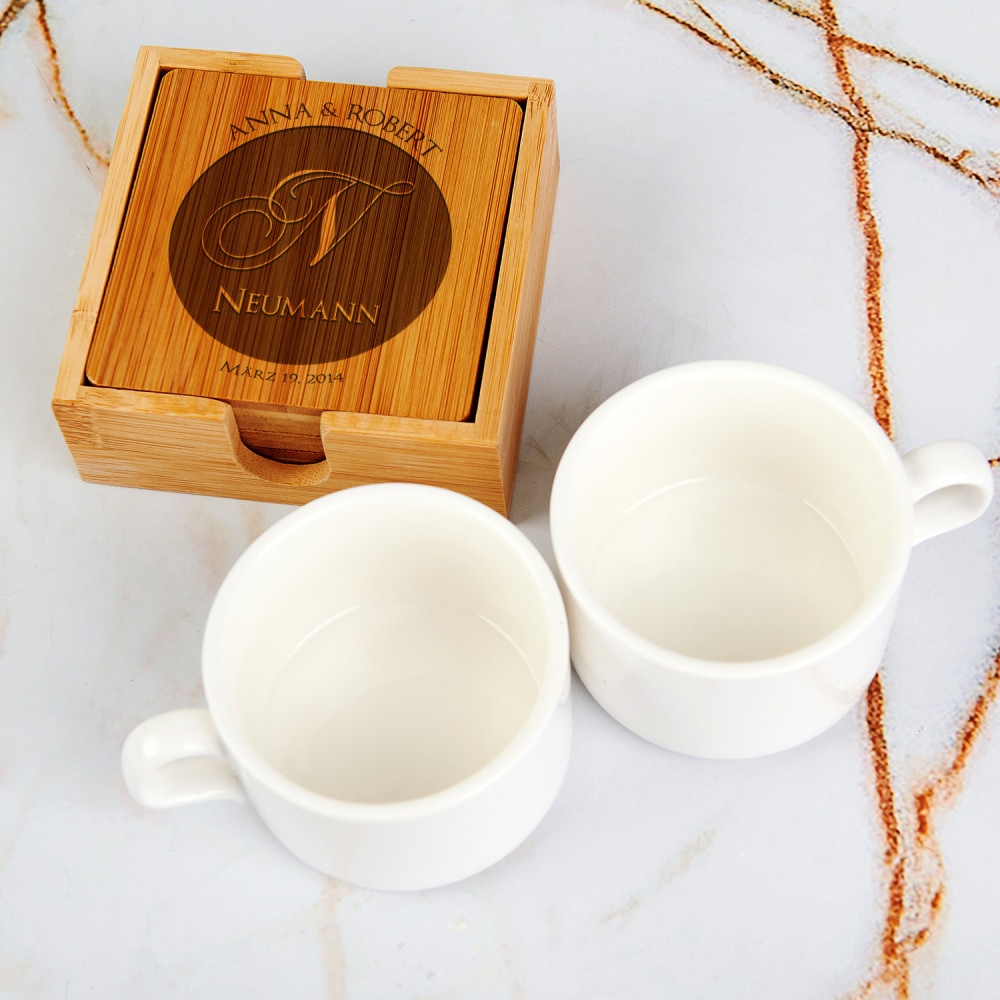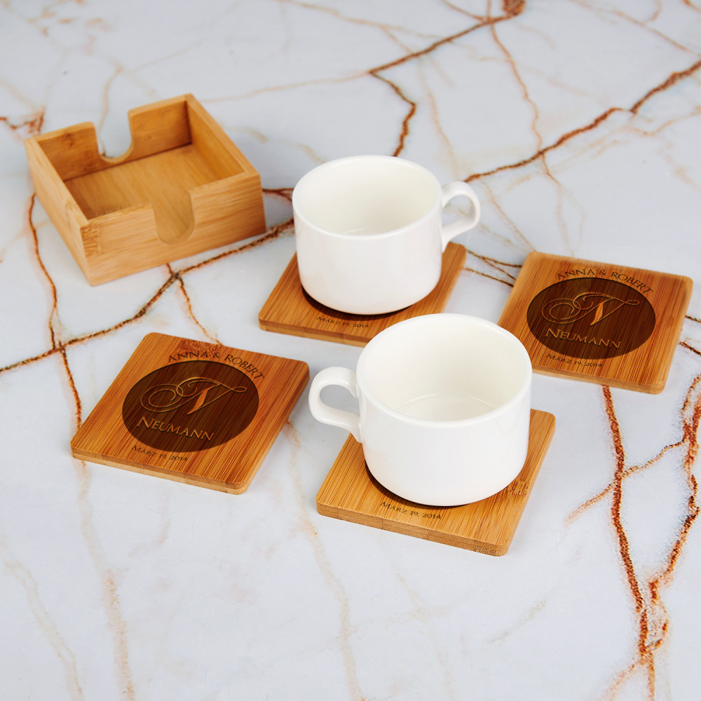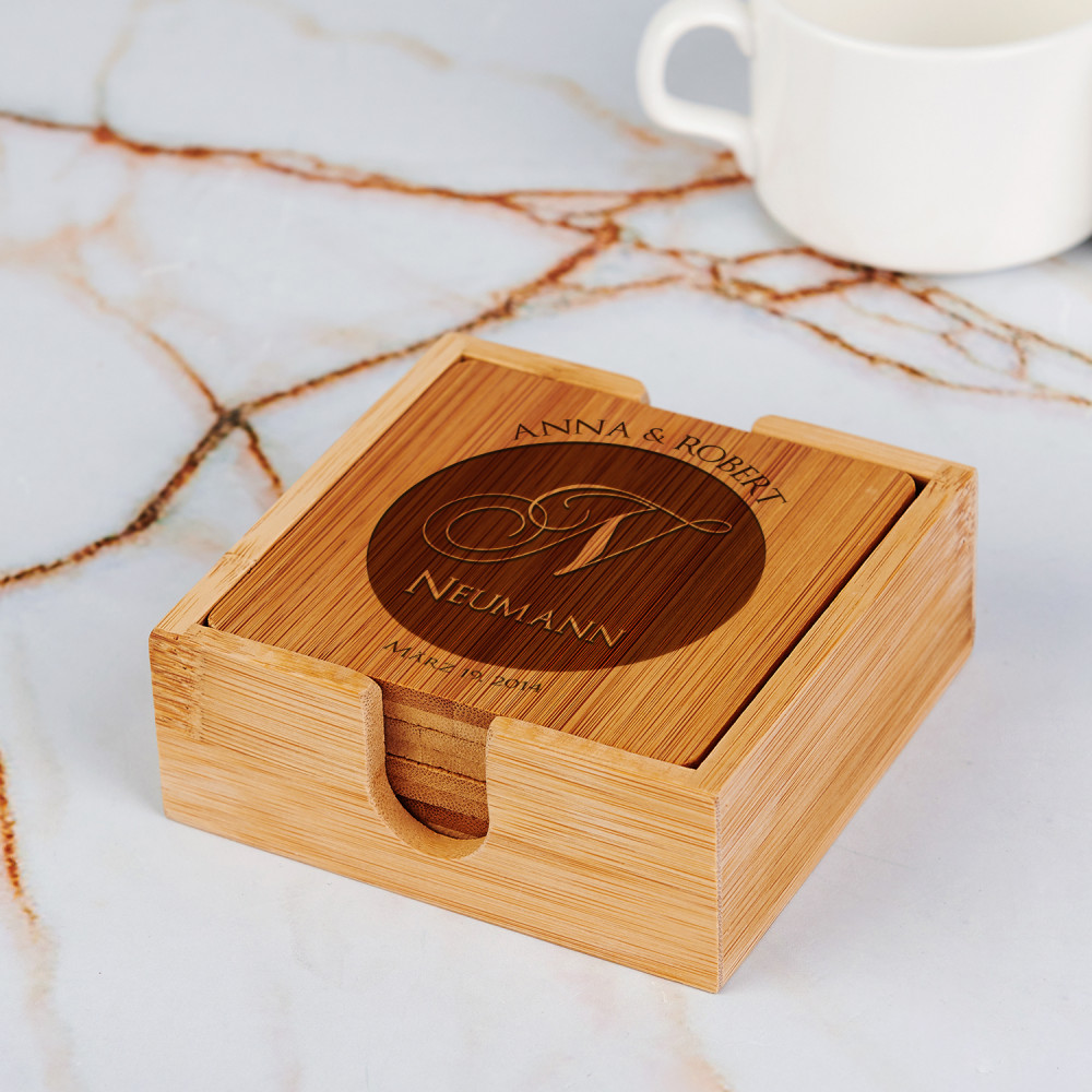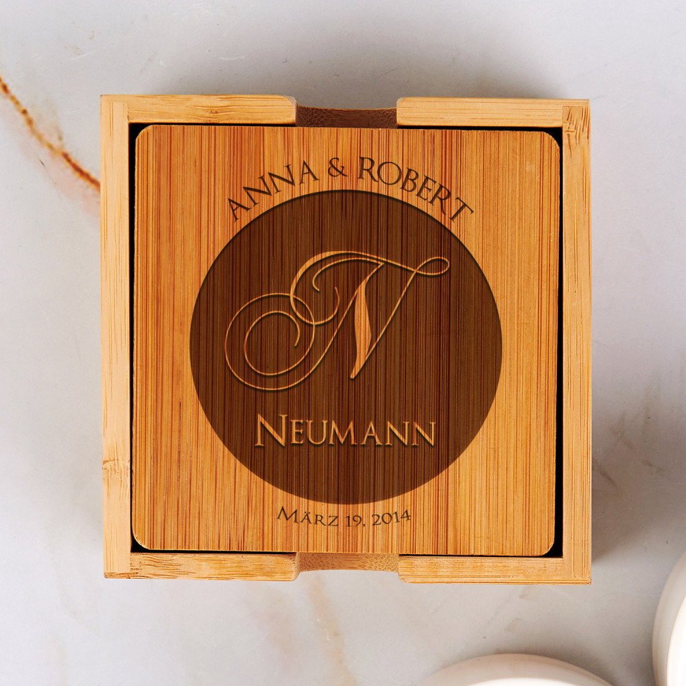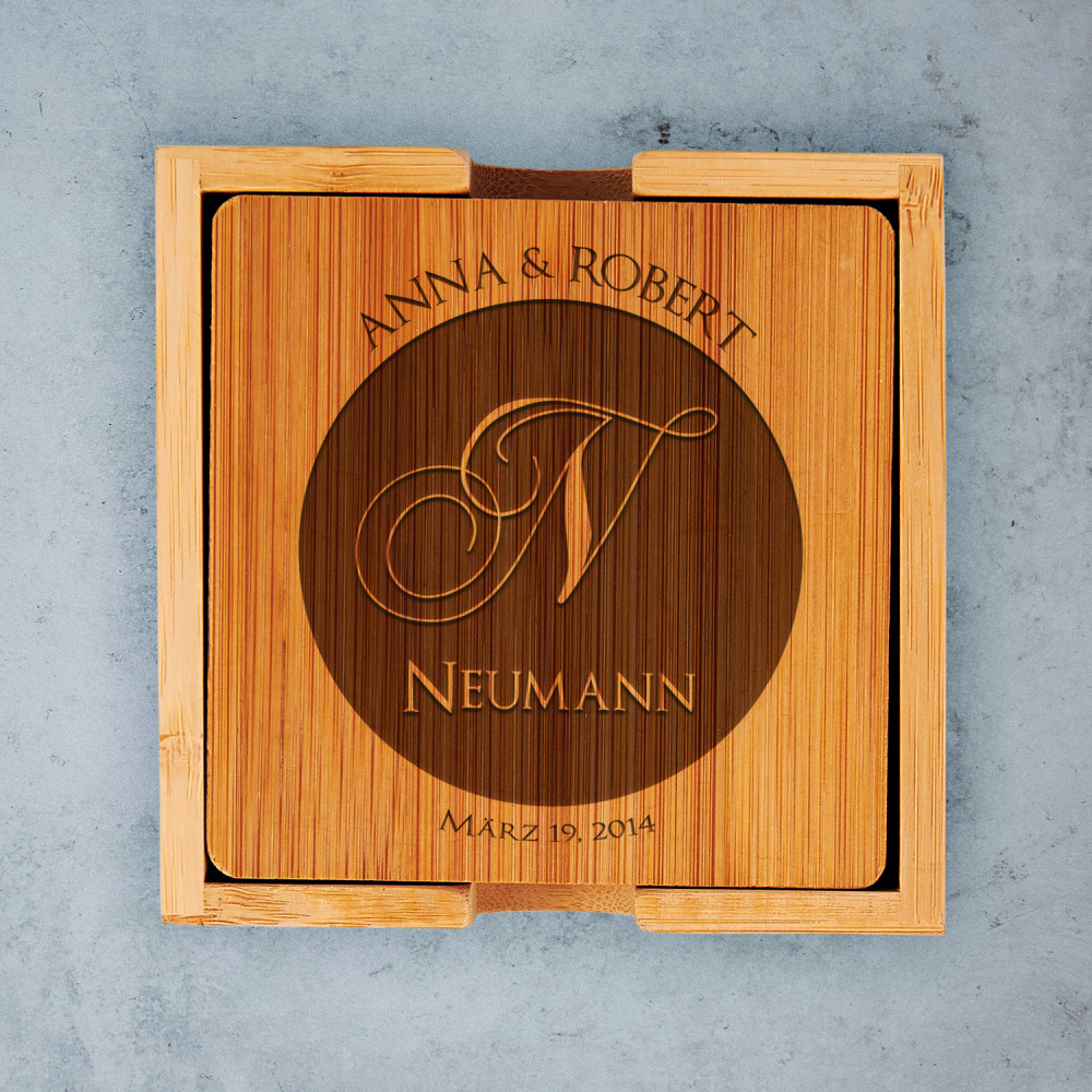 Ein einzigartiges Bambusuntersetzer-Set mit effektvolledrr Gravur ist ein praktisches Geschenk für alle. Das Set enthält 4 Untersetzer und eine Box , in der sie bequem aufbewahrt werden können. Durch die klassische Form und die natürliche Farbe des Holzes passt das Produkt in jedes Interieur und ist eine schöne Ergänzung für den täglichen Gebrauch.Maße: 110×110×40 mm