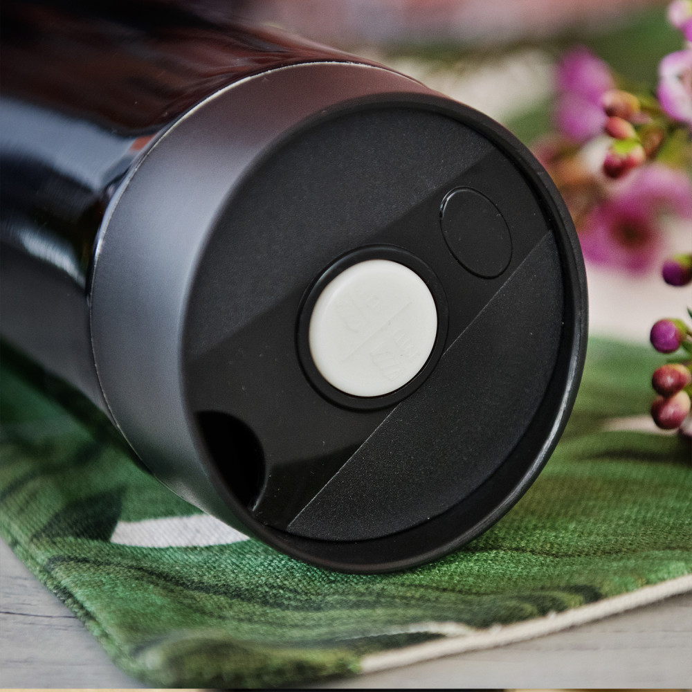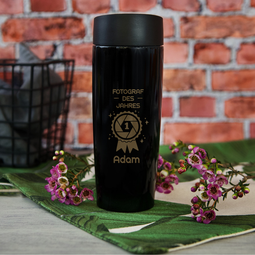 Innenseite - zwei Wände aus rostfreiem Stahl mit Vakuum dazwischen. Außenseite - metallischer Kunststoff in Schwarz mit personalisierbarer Gravur. Der Becher enthält ein Plastik-Deckelchen mit push open/close-Funktion.