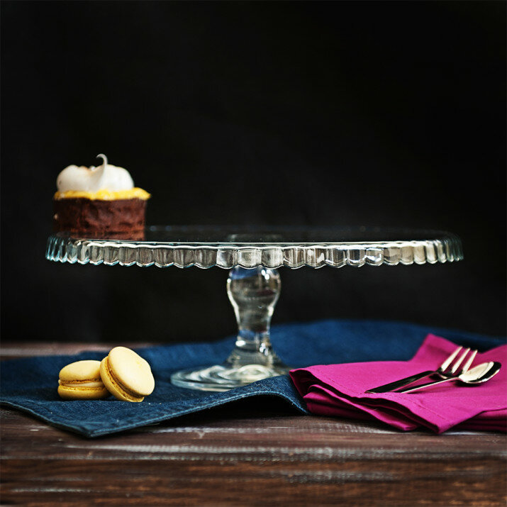Runde Tortenplatte mit Fuß aus Glas, das 2-3 mal haltbarer ist als Produkte mit ähnlicher Dicke aus Porzellan oder Keramik.Die Oberfläche des Kuchentellers ist absolut glatt. Die Gravur befindet sich auf der ganzen Oberfläche!