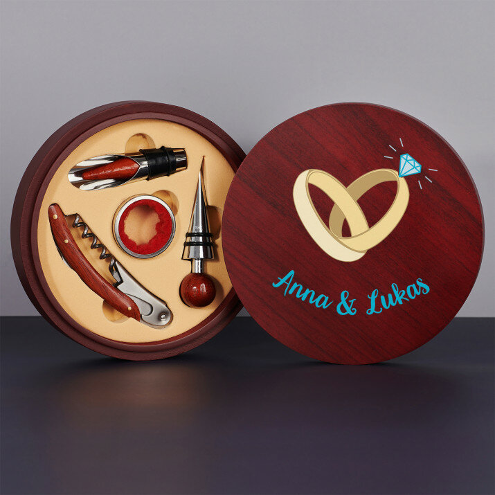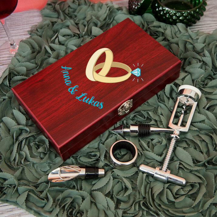 An einem romantischen Abend mit Wein brauchen Sie ein spezielles Weinset. Unser Hochzeitsmotiv wird die Erinnerungen an diesen Tag wieder zum Leben erwecken.