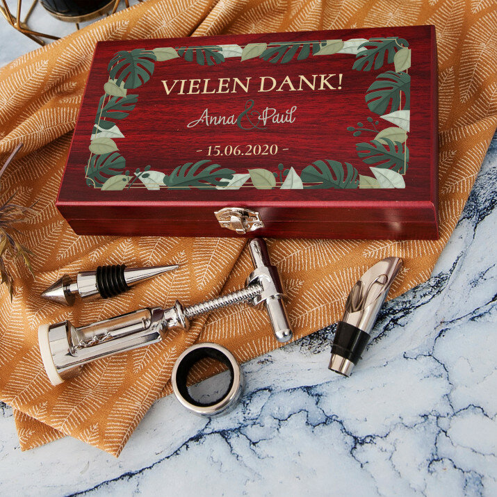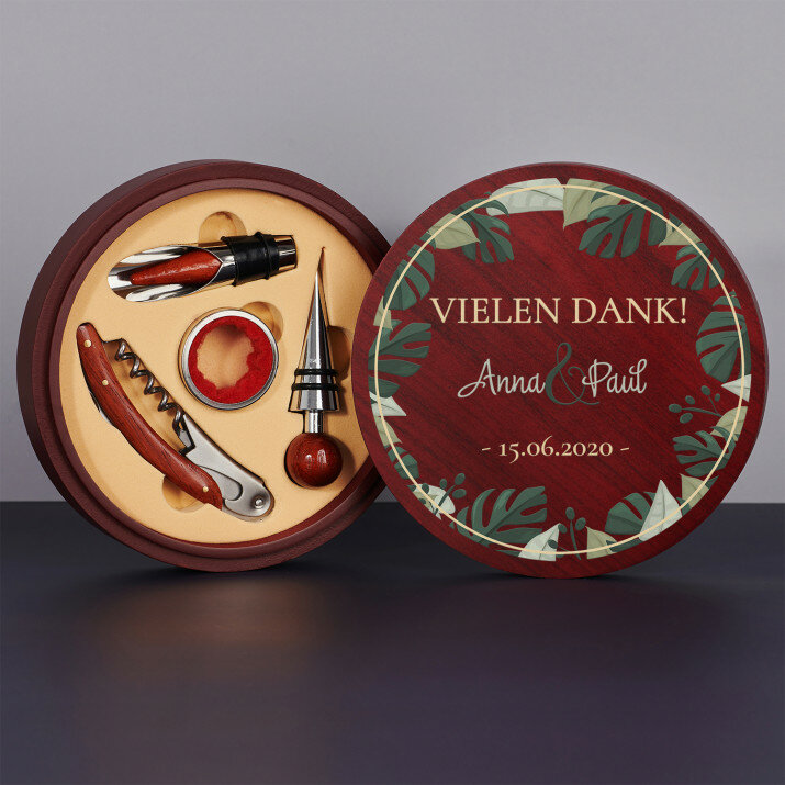 Jeder Weinliebhaber wird sich in diesem Set verlieben! Ein solches Geschenk ist perfekt für ein Jubiläum, eine Hochzeit und viele andere Anlässe. Abende mit Ihrem Lieblingswein werden noch angenehmer!Anfertigung