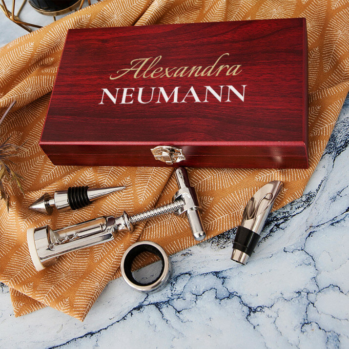 Ein schönes vierteiliges Weinset in einer eleganten Schachtel mit Aufdruck auf dem Deckel. Es stehen zwei Versionen zur Auswahl: