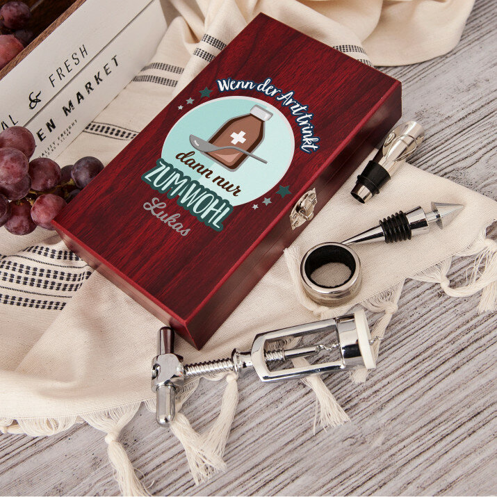 Ein schönes vierteiliges Weinset in einer eleganten Schachtel mit Aufdruck auf dem Deckel. Es stehen zwei Versionen zur Auswahl:Rechteckiges Set, bestehend aus einem Korkenzieher, 2 Stopfen (davon einer mit Ausgießfunktion) und einem Flaschenhalsring, der das Auslaufen verhindert.