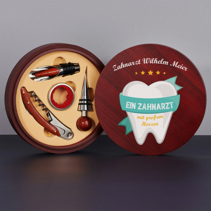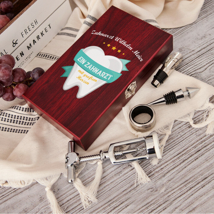 Ein schönes vierteiliges Weinset in einer eleganten Schachtel mit Aufdruck auf dem Deckel. Es stehen zwei Versionen zur Auswahl:Rechteckiges Set, bestehend aus einem Korkenzieher, 2 Stopfen (davon einer mit Ausgießfunktion) und einem Flaschenhalsring, der das Auslaufen verhindert.