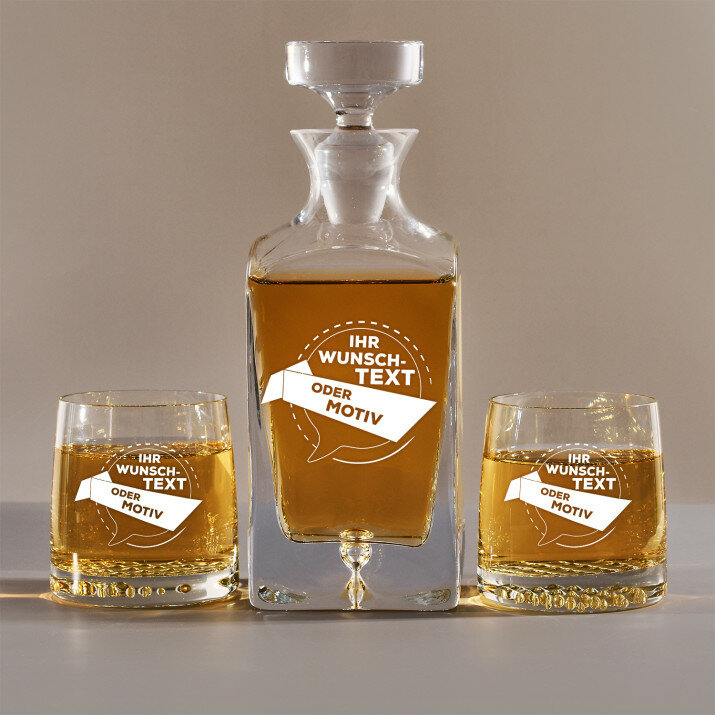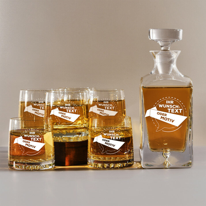 Das Set besteht aus einer stilvollen Karaffe (Fassungsvolumen: 1 L) und mehreren eleganten Whiskygläsern (Fassungsvolumen: 250 ml). Alle Elemente des Sets werden in der EU hergestellt. Höhe der Karaffe (mit Stöpsel): 25,5 cm, Höhe der Gläser: 9,8 cm.Folgende Optionen sind erhältlich: